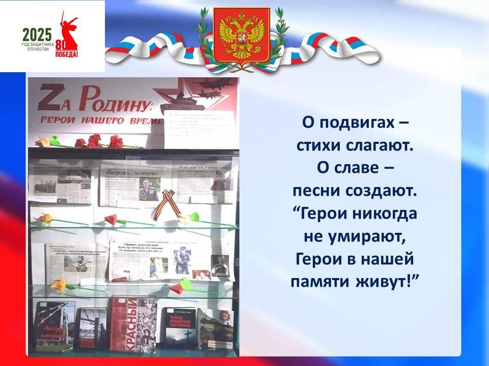 Мужеству и отваге, боевому братству и верности воинскому долгу, стойкости и самопожертвованию участников специальной военной операции посвящена открытая в симферопольской библиотеке-филиале №14 им. В. Ф. Войно-Ясенецкого МБУК ЦБС для взрослых выставка доблести и подвига постоянно действующая «Zа Родину: Герои нашего времени» из цикла «Героические страницы истории России».