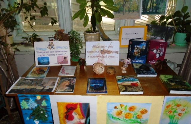 У каждого человека до конца дней сохраняется благодарная любовь к тому месту, откуда берет начало его жизнь, – к отчему краю. Книжно-предметная выставка «Талант – это капелька божией крови в человеческой душе…» - это вдохновение крымскими достопримечательностями, давний друг и читательница библиотеки делится своими впечатлениями о полуострове. Картины написаны на различную тематику. Еще одна читательница очень любит фотографировать, ее работы тоже можно увидеть. Ярким и красочным дополнением выставки стали рисунки юных читателей.