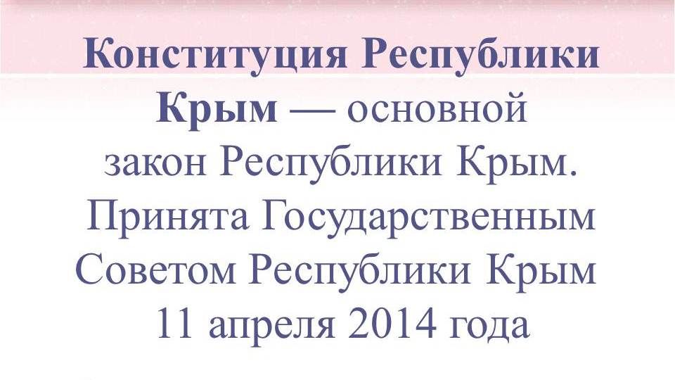 Конституция Республики Крым была принята Государственным Советом Республики Крым 11 апреля 2014 года.