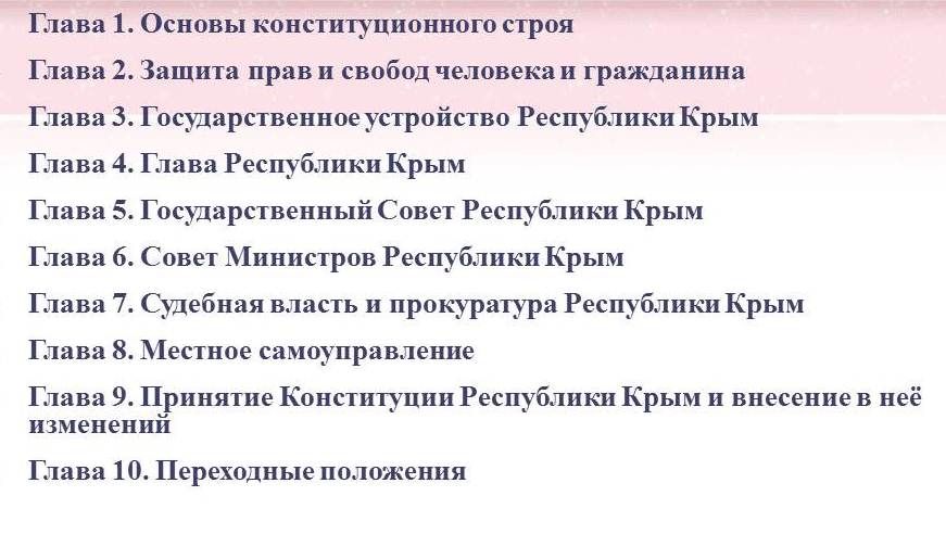 Согласно новой Конституции и статье 1, Республика Крым является демократическим, правовым государством в составе Российской Федерации и равноправным субъектом РФ.
